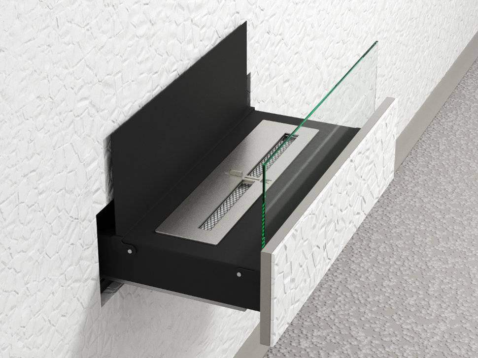 Представляет собой сборную выдвижную металлическую конструкцию (внешний корпус + механизм трансформации и выдвижной элемент с топливным блоком ), способную создать полуоткрытое безопасное пространство для огня ограниченную складывающимся защитным экраном (закаленным стеклом) и металлическим отражателем.Предназначен для встраивания в межкомнатные перегородки из ГКЛ, мебель из МДФ, ЛДСП, конструкций из кирпича, пеноблоков, бетона.