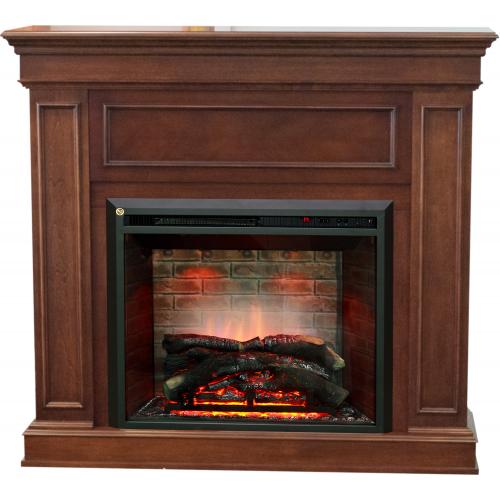 Основание электрического камина в сборе с порталом исполнено из металла - электрокамин и МДФ - портал. В комплекте идет пульт для дистанционного управления. Кроме этого, именно в этой модели есть специальный режим для регулировки яркости пламени и топки. Цвет очага - черный, в комплекте идет муляж прогоревших дров, а также термостат. Есть две ступени нагрева, декоративный режим, а также обогрев.